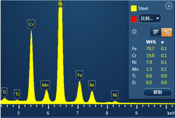 2、能谱:可对固体材料的表面涂层、镀层、金属材料的相、成分分析,进行材料表面微区成分的定性和定量分析,在材料表面做元素的面、线、点分布分析。一般只能测C(含C)以后的元素,(B元素也能做,但是不准,不建议做)如果需要打能谱,需要备注好测试位置以及能谱打哪些元素,需要注意的是制样时待测元素不能与基底成分有重合,如果要测C元素,样品不要分散到含C的基底上,可以分散到硅片、锡纸上,如果要测Si元素,注意不要制样到硅片上。金属材料的相分析、成分分析和夹杂物形态成分的鉴定。