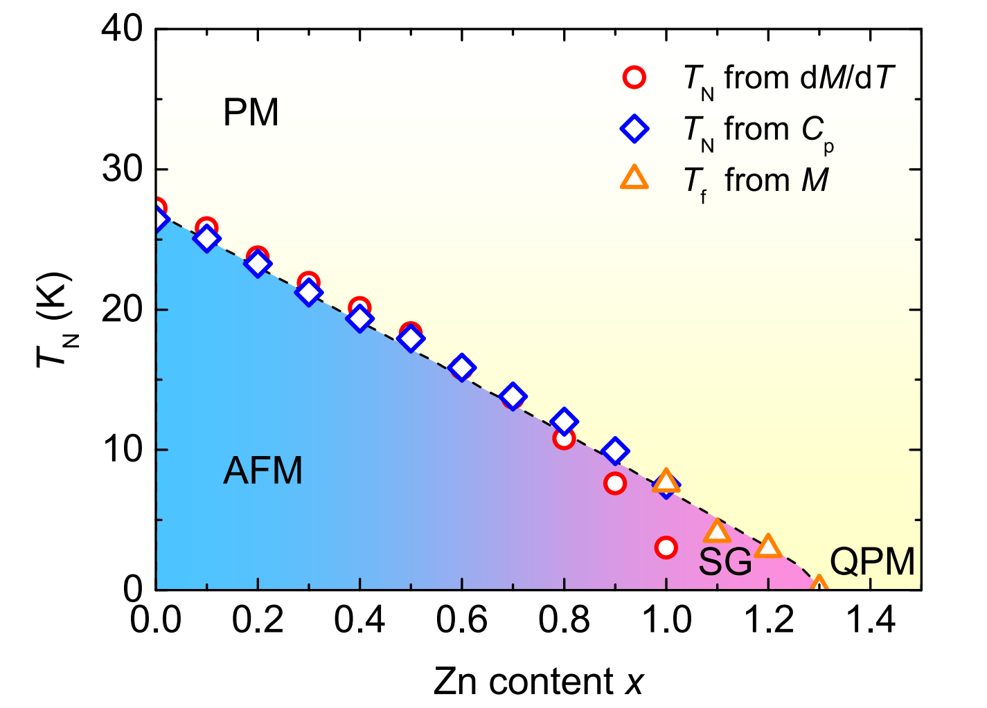 Kitaev模型是建立于二维六角蜂窝晶格的量子自旋液体模型,并伴有马约拉纳费米子激发和衍生规范场,在未来的量子计算中具有潜在应用价值。其中,Kitaev相互作用是该模型的核心,在真实体系中实现它成为了当前强关联电子领域的一个中心话题。最近有研究指出,具有蜂窝晶格的3d电子钴氧化物Na2Co2TeO6中存在Kitaev相互作用,但是非Kitaev项使系统在低温时发生反铁磁相变。我校先进材料研究院马祯团队利用无磁离子Zn2+对母体中的Co2+进行部分替代,从而引入自旋缺陷,尝试在不破坏晶体结构的基础上对基态进行调控。研究发现,母体的反铁磁基态对Zn2+掺杂很不敏感,在掺杂量x = 1.0时长程磁序才被完全抑制。随着掺杂浓度的增加,系统进入短程有序的自旋玻璃态,最终在x ≥ 1.3时转变为顺磁态。以上结果清晰记录了系统磁基态的演变过程,并给出了Na2Co2-xZnxTeO6的磁相图。该工作表明,Zn2+掺杂可以作为增强量子涨落的一种手段,并可能诱导出与自旋液体有关的量子顺磁行为。