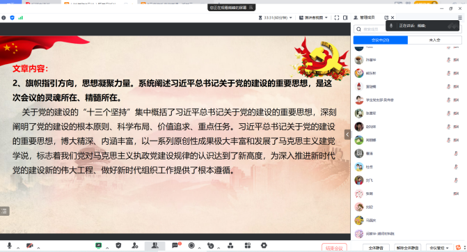 在研讨交流环节,张勇军、熊东彬同志作交流发言,一致表示要坚定理想信念,拒腐防变,弘扬伟大建党精神,在本职岗位上,保持初心,踏实工作,推动材料科学与工程学院快速、高质量发展。