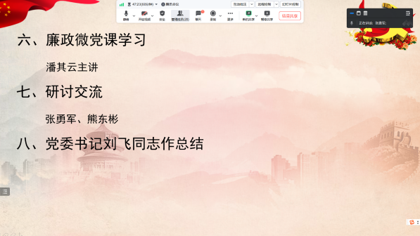 在党风廉政纪律教育活动中,刘飞同志组织全体党员进行中国共产党纪律处分条例、中华人民共和国监察法、中华人民共和国公职人员政务处分法等党内法规和法律法规的学习;潘其云同志带领大家进行廉洁廉政的微党课学习。督促全体党员干部始终保持对“腐蚀”“围猎”的警觉。