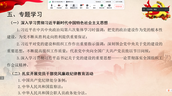 在党风廉政纪律教育活动中,刘飞同志组织全体党员进行中国共产党纪律处分条例、中华人民共和国监察法、中华人民共和国公职人员政务处分法等党内法规和法律法规的学习;潘其云同志带领大家进行廉洁廉政的微党课学习。督促全体党员干部始终保持对“腐蚀”“围猎”的警觉。