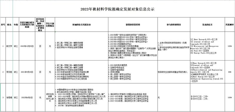 陈文学,性别男,汉族,本科文化,湖北省孝感市人,1996年11月23日出生,2021年9月就读于湖北师范大学。该同志于2022年4月15日提出入党申请,2022年10月25日被确定为入党积极分子。经党支部培养教育和考察,该同志已基本具备党员条件,在听取党小组、培养联系人、党员和群众意见的基础上,经支委会2023年11月6日讨论,拟确定陈文学同志为发展对象。