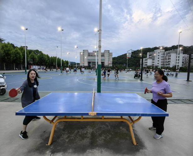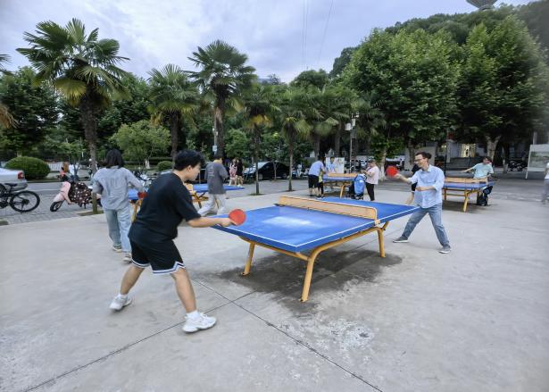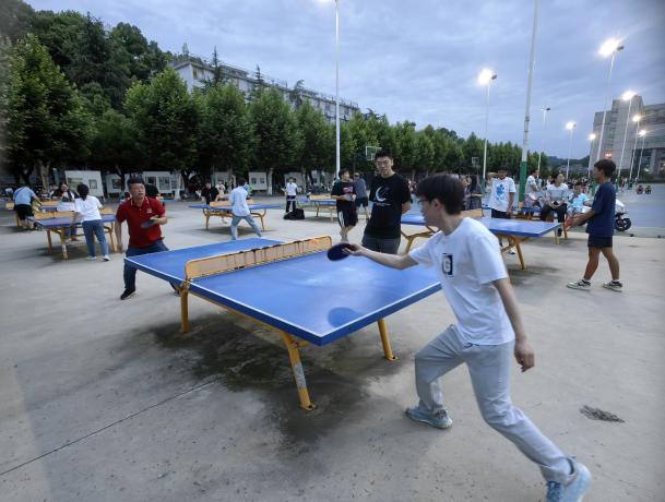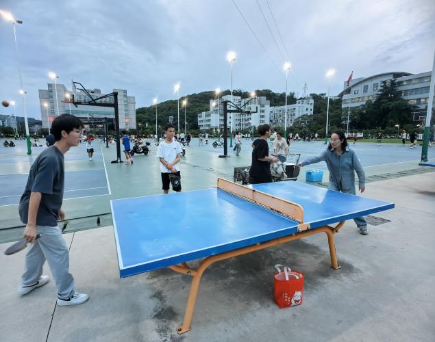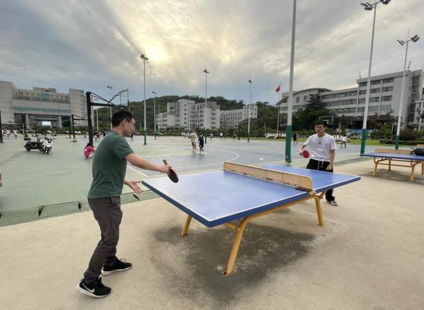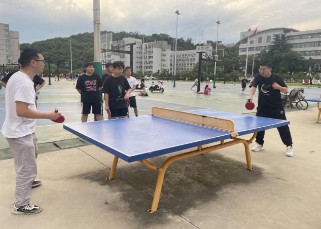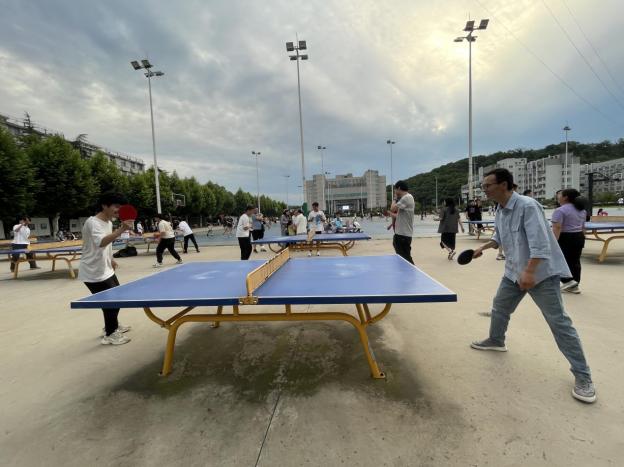 6月3日傍晚,在学校乒乓球场上,师生们热情高涨,精神焕发。他们挥舞着球拍,展示着精湛的球技。乒乓球在桌面上快速弹跳,发出清脆的声响,伴随着观众的喝彩声,整个球场充满了欢乐与激情。