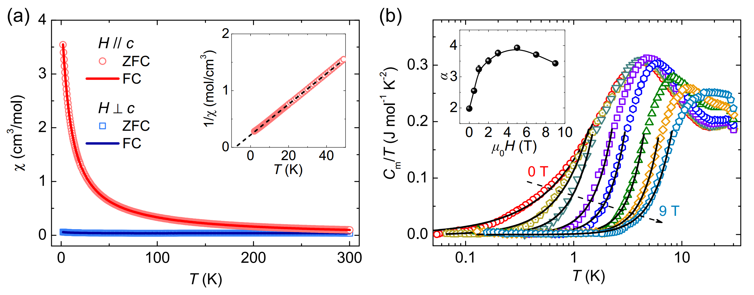量子自旋液体代表了一种非平庸的量子顺磁相,然而实验上能够实现该量子态的真实材料体系十分稀少,且大多集中在几何阻挫海森堡磁体中。我们制备了一种新的三角晶格稀土氧化物PrMgAl11O19,并进行了系统的物性研究。磁化率结果显示,材料在2-300 K的测试区间上没有发生任何相变,且沿着晶体c轴的磁化强度要比ab面内大两个数量级,说明这是一个理想的伊辛磁性系统。比热表征也没有发现长程磁相变,零场下的极低温磁比热与温度的平方具有依赖关系,说明磁无序基态可能是无能隙的狄拉克型量子自旋液体。非弹性中子散射测量验证了低温下磁无序的特征,且布里渊区中弥散的磁激发信号也和量子自旋液体态的特征相吻合。因此,该工作证明了经典的伊辛系统也能展示量子自旋液体行为,为深入理解量子磁性物理提供了新的研究平台。