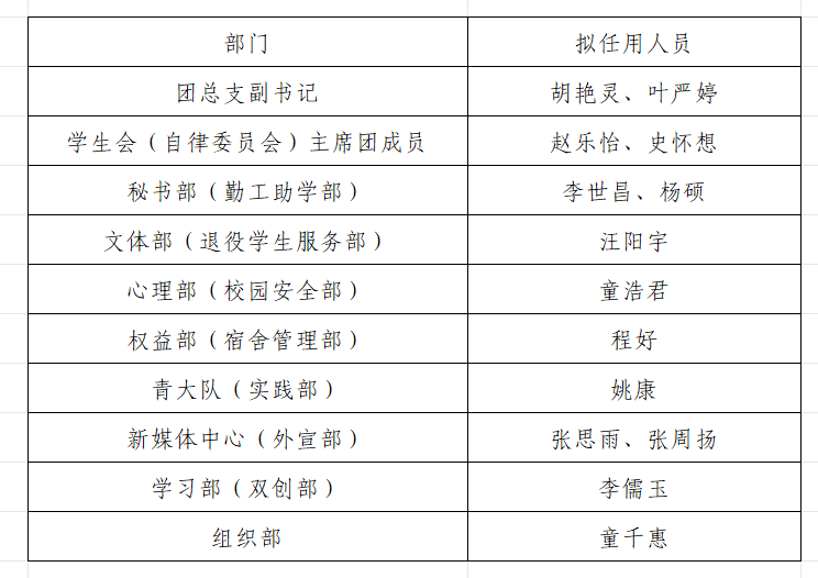 为了更好地充分发挥学生组织服务师生、自我管理的积极作用,努力建设一支素质优良、结构合理的团学干部队伍,本着公平、公开、公正的原则,经过个人申请、面试答辩、民意测评、组织考察等环节,学院团总支拟任用史怀想等14名学生为材料科学与工程学院第一届团学组织学生干部,考察期三个月(2024年7月至10月)。