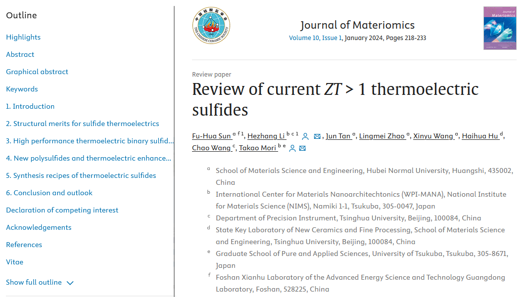 近日,304am永利集团孙富华副教授团队应邀在Journal of Materiomics第10卷第1期发表了题目为“Review of current ZT > 1 thermoelectric sulfides”的综述论文。《Journal of Materiomics》为中科院一区TOP期刊,影响因子9.4,入选首批中国科技期刊卓越行动计划,注重报道以材料设计、制备、表征及应用技术为主线的系统性前沿研究成果。