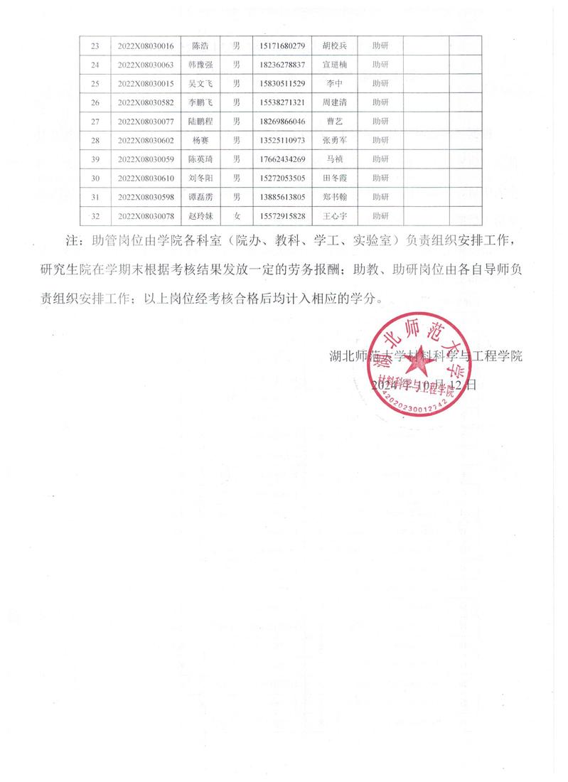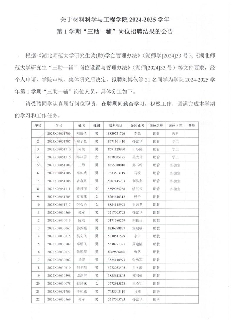 关于材料科学与工程学院2024-2025学年第1学期“三助一辅”岗位招聘结果的公告