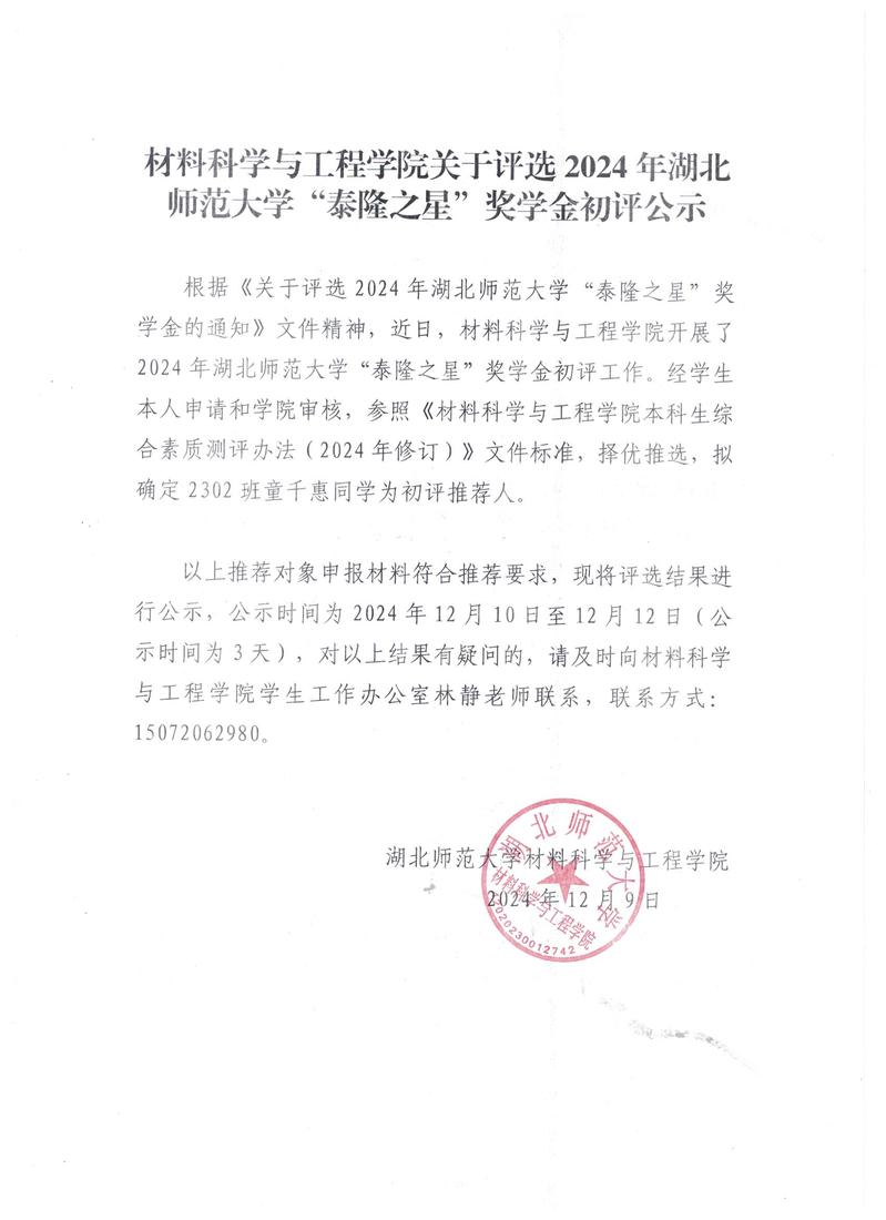 材料科学与工程学院关于评选2024年湖北师范大学“泰隆之星”奖学金初评公示