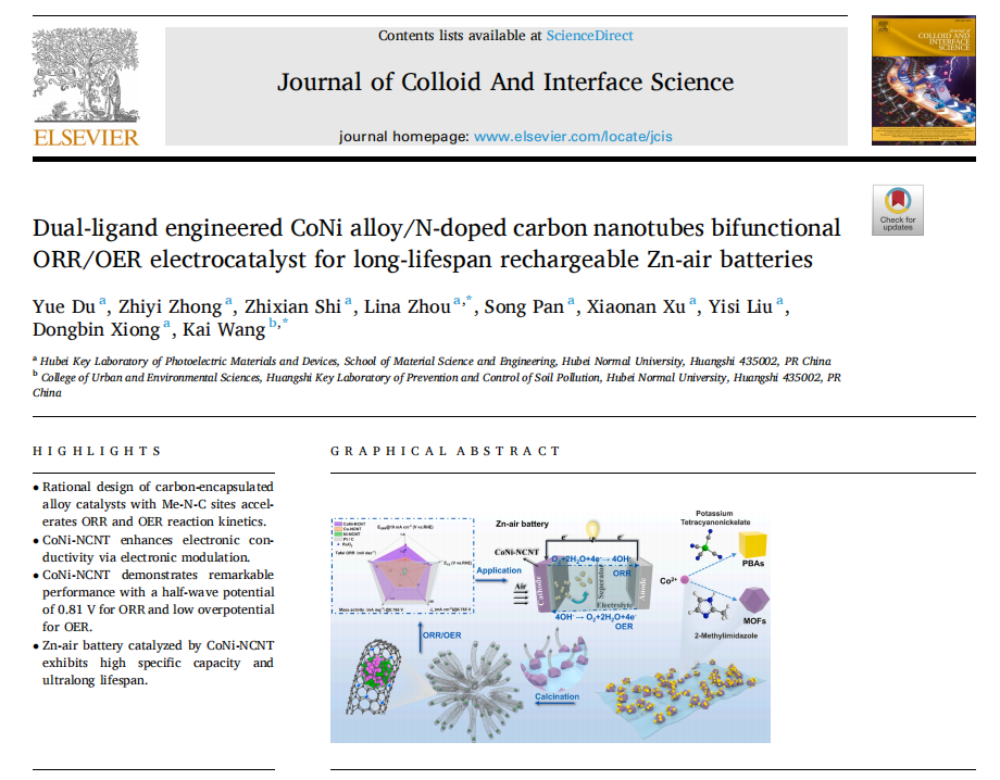 一、通过创新的双配体策略,成功实现了合金碳纳米管的原位制备,所制备复合材料独特的CoNi-CoN3复合活性中心显著提升了催化剂的活性和稳定性。同步辐射与理论计算表明,CoNi合金的3d轨道电子调制增强了ORR/OER过程中的电子传导性,使CoNi-NCNT在碱性电解液中表现出优异的双功能催化性能,其ORR半波电位达0.81 V,OER过电位在10 mA cm⁻²时仅为1.52 mV。由CoNi-NCNT组装的RZAB展现出高比容量(780 mAh g-1)和超长循环寿命(超过800 h),功率密度高达164 mW cm-2。该研究为高性能金属空气电池阴极材料的开发提供了新的研究思路。该工作以“Dual-ligand engineered CoNi alloy/N-doped carbon nanotubes bifunctional ORR/OER electrocatalyst for long-lifespan rechargeable Zn-air batteries”为题,发表于国际知名期刊Journal of Colloid and Interface Science(中科院一区TOP期刊,2024年影响因子9.4,大类:材料科学,小类:界面、包覆与膜,排名:6/132)。杜岳为该论文第一作者,湖北师范大学光电转换材料与器件湖北省重点实验室为第一通讯单位。