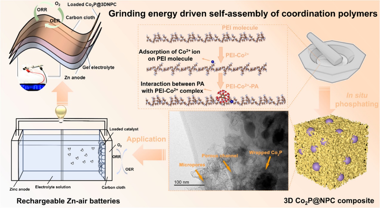 二、通过化学诱导自组装-原位磷化策略构筑了三维多孔N、P共掺杂碳包裹磷化钴复合材料(Co2P@3DNPC)。采用密度泛函理论阐述了金属离子、植酸(PA)和聚乙烯亚胺(PEI)分子间的分子组装行为,指导了稳定有机-无机前驱物的可控合成。所制备Co2P@3DNPC材料具有优异的ORR/OER双功能活性,RZAB的功率密度达148.5 mW cm-2,并且在充放电循环中具有显著的稳定性(>480 h)。相互连接的多孔结构和嵌入的Co2P纳米粒子优化了电极-电解质界面接触,有效提升了RZAB的能量密度和循环寿命,为高效、稳定双功能氧电催化剂的合成提供了新策略。该研究成果以 “Coordination polymer derived transition metal phosphide/carbon composites for bifunctional oxygen electrocatalyst” 为题,发表于国际期刊 Journal of Materials Science & Technology(中科院一区TOP期刊,2024年影响因子11.2,大类:材料科学,小类:金属与合金,排名:4/176,入选中国科技期刊卓越行动计划与中国最具国际影响力学术期刊)。杜岳为该论文第一作者,湖北师范大学光电转换材料与器件湖北省重点实验室为第一通讯单位,在上海理工大学窦世学院士的指导下,与温州大学肖遥教授合作完成。
