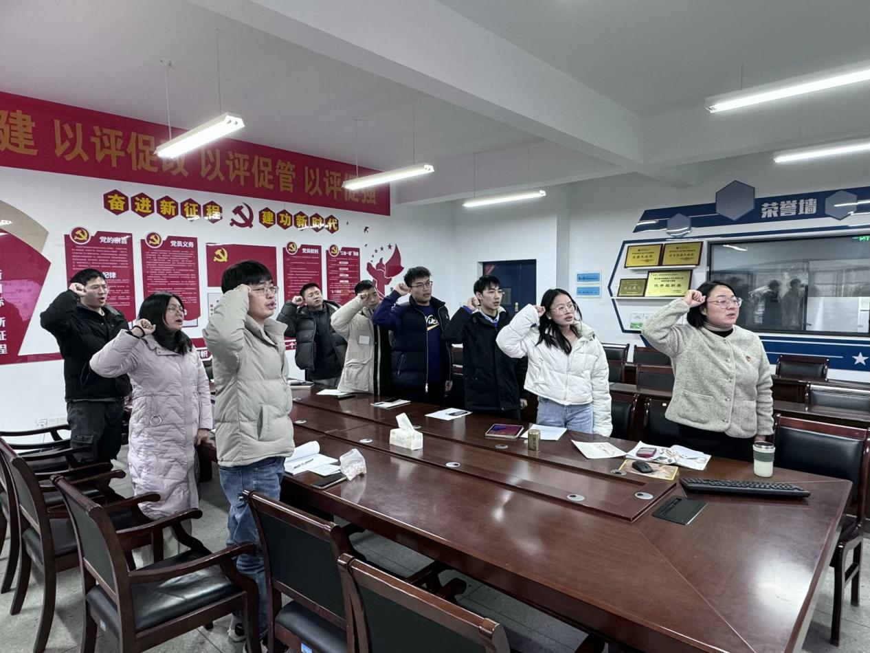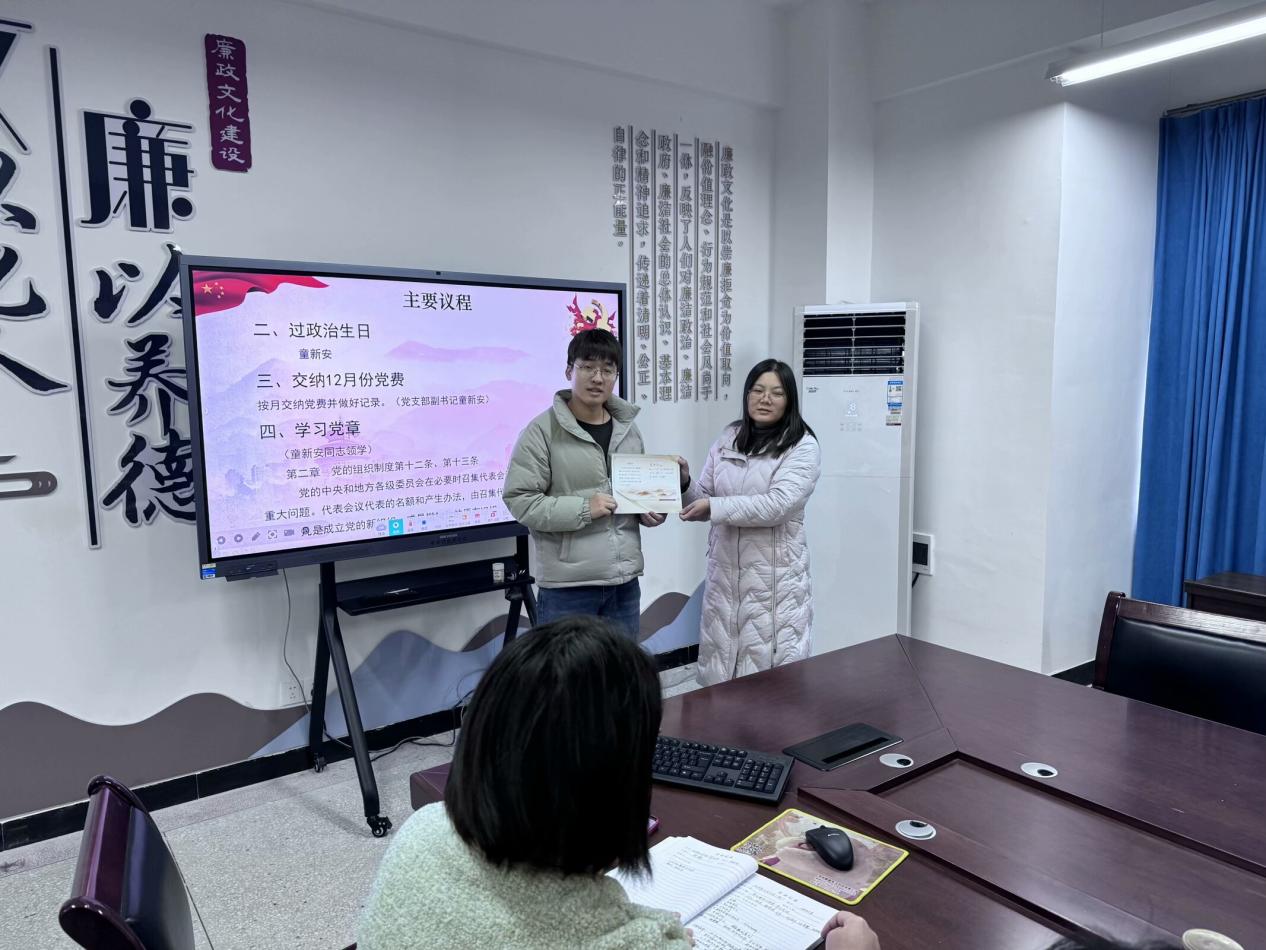 活动中,支部党员按月交纳党费并重温入党誓词,在童新安同志带领下一起诵读《中国共产党章程》第二章第十二、十三条。在党员过政治生日环节,殷婷婷同志为党员赠送政治生日卡。