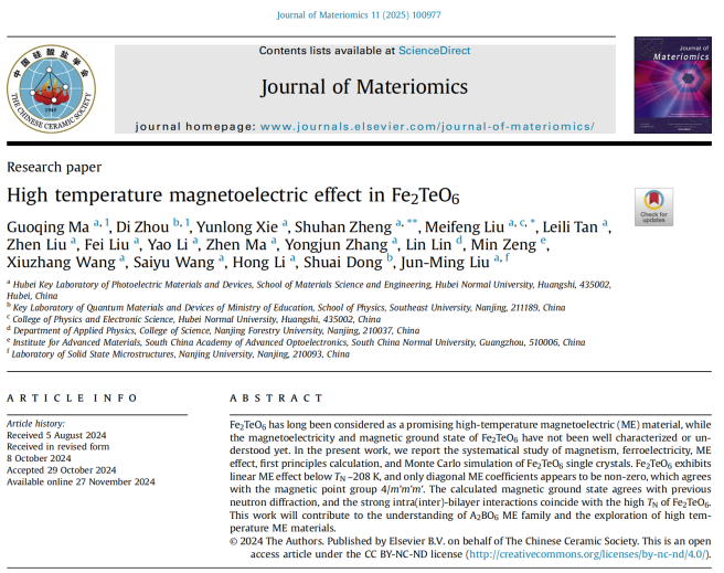 一、Fe2TeO6是一个经典的线性磁电材料,其磁相变温度高(TN ~ 208 K),磁电耦合效应显著,基于该体系发展具有近室温的高性能磁电材料具有一定潜力。然而,在关于Fe2TeO6的研究中往往使用多晶样品,导致对其的物性表征不全面,认识不够完善,阻碍了进一步的研究。郑书翰团队通过化学气相输运法成功生长出高质量的Fe2TeO6单晶,并从实验和理论方面对其展开了研究。结果表明当电场和磁场方向平行时,在TN以下存在线性磁电效应,符合磁点群4/m′m′m′。在9 T磁场下,c方向铁电极化达到8.8 μC/m2,ab面内铁电极化达到4 μC/m2。第一性原理计算得到Fe3+自旋双层内和双层间均为反铁磁构型,与中子实验结果相吻合。据此结果得到磁相互作用参数J1 = -18.64 meV,J2 = -18.64 meV,这解释了Fe2TeO6高磁相变温度的原因。这项工作为理解Fe2TeO6的磁电性能以及开展后续材料探索打下了良好基础。该成果以“High temperature ME effect in Fe2TeO6”为题发表于国产高水平期刊Journal of Materiomics [J. Materiomics 11, 100977 (2025)]。304am永利集团2020级研究生马国庆与东南大学研究生周迪为共同第一作者,郑书翰博士和我校物理与电子科学学院刘美风教授为共同通讯作者,湖北师范大学为第一署名单位。304am永利集团刘俊明教授以及东南大学董帅教授对该工作进行了深入指导。