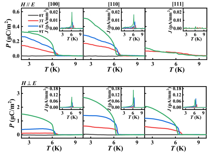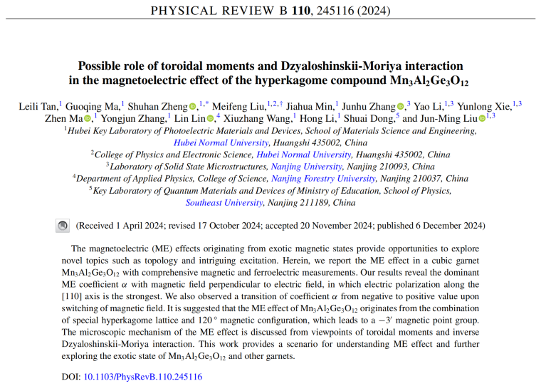 二、铁电性的存在要求打破空间反演对称性,因此晶格具有高度对称性(如立方晶格)的材料体系往往难以实现磁电耦合效应。反而言之,在高度对称的系统中实现磁电耦合,往往伴随着新奇效应或者磁激发,探索相关材料具有重要价值。在前期工作中,郑书翰团队在立方结构的石榴石材料Mn3Al2Ge3O12中发现了磁电耦合效应[Inorganic Chemistry 61, 86−91(2022)],在此工作基础上,郑书翰团队通过光学浮区法进一步生长出Mn3Al2Ge3O12单晶,对其磁电性能展开系统研究,并对其磁电耦合机制展开深入讨论。研究发现,Mn3Al2Ge3O12不同方向的磁电耦合系数均为非零项,且当电场和磁场方向垂直时,磁电耦合效应最强。从对称性角度看,Mn3Al2Ge3O12的磁电耦合效应来源于其-3’磁点群。其磁电耦合微观机制从逆DM相互作用以及环形磁矩两方面进行了讨论。这项工作为探索立方结构材料中的磁电效应,以及进一步探索石榴石材料中的特殊物态提供了帮助。该成果以“Possible role of toroidal moments and Dzyaloshinskii-Moriya interaction”为题发表于美国物理学会知名期刊Physical Review B [Phys. Rev. B 110, 245116 (2024)]。304am永利集团2022级硕士生谭磊雳为论文的第一作者,郑书翰博士和我校物理与电子科学学院刘美风教授为共同通讯作者,湖北师范大学为第一署名单位。304am永利集团刘俊明教授对该工作进行了深入指导。