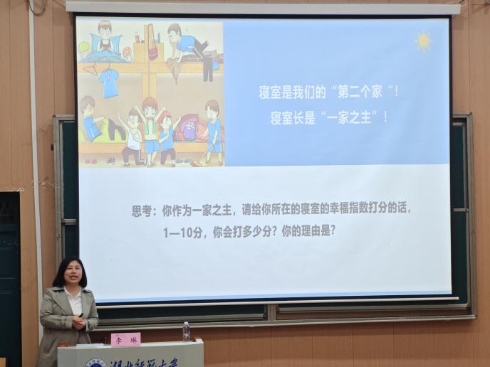 活动中,李琳老师首先通过“雨点变奏曲”暖身活动环节,带领同学们体会情绪的变化,让大家在互动中放松心情。然后以“寝室长的角色定位”为切入点,结合大学生常见心理问题案例,系统讲解了寝室长在心理健康教育中的重要职能。她通过 “危机识别”“情绪急救”两个方面,结合实际案例重点讲解了寝室长如何在日常学习生活中观察室友心理动态、掌握寝室里重点需要关注的哪些类型同学,如何运用科学的沟通技巧助人或自助,并详细介绍了学校心理危机干预的工作流程与资源支持。最后,她还介绍了如何通过构建整洁舒适寝室环境、和谐民主沟通、学会接纳与欣赏等小技巧来提升寝室幸福指数,共同营造温馨学习、生活寝室氛围,一起守住学生心理健康防线。