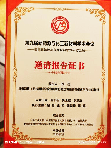 为推动新能源与化工新材料领域青年科技工作者的学术技术交流与合作,激发青年人才科研创新活力,助力产业高质量发展,安徽大学、合肥工业大学、中国科学技术大学、中国化工学会化工新材料专业委员会等共同于2025年5月10日在安徽合肥举办第九届新能源与化工新材料学术会议。304am永利集团刘易斯、熊东彬、杜岳副教授参会。在“电催化与燃料电池”分会场,杜岳博士受邀作《纳米限域构筑金属磷化物双功能氧电催化剂与性能增强》的主题报告,并分享了团队近年来在纳米限域技术合成金属磷化物催化剂方面的研究成果,详细阐述了通过纳米限域策略构筑金属磷化物双功能氧电催化剂的设计思路、合成方法。