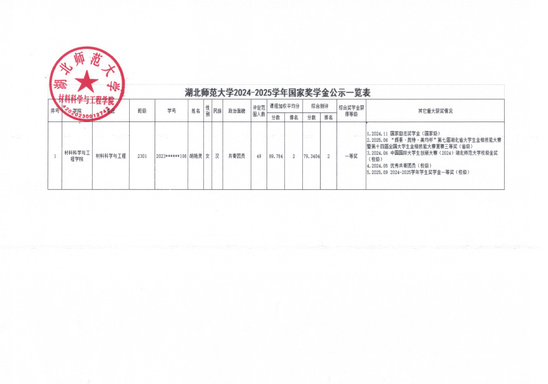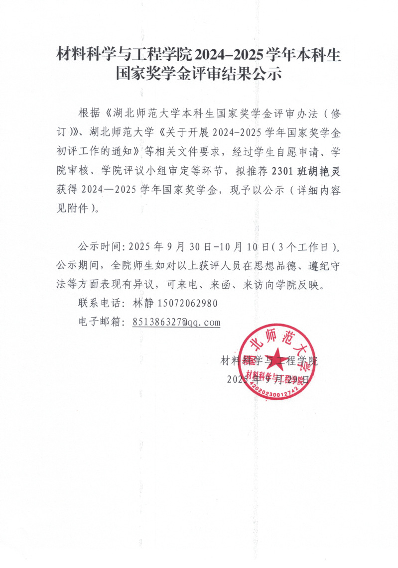 材料科学与工程学院2024-2025学年本科生国家奖学金评审结果公示