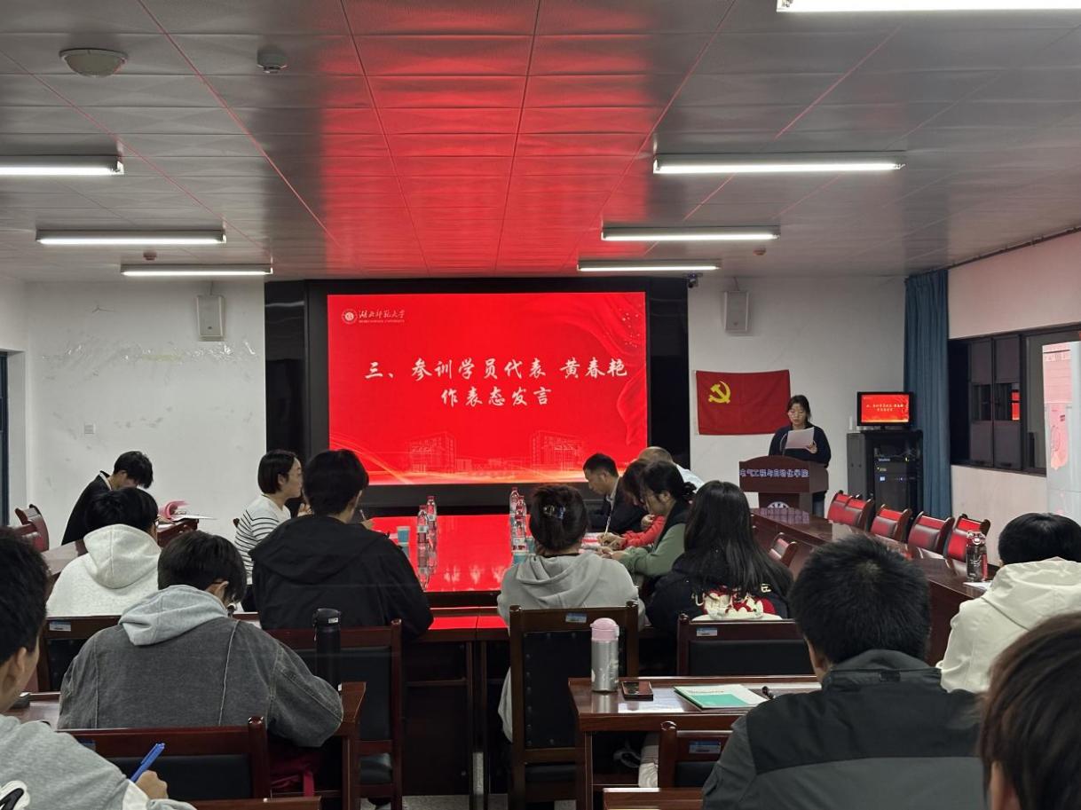 材料学院2401班黄春艳作为学员代表发言。她代表全体学员感谢学校及学院提供的宝贵学习机会,并结合青年使命,提出与同学们共勉的三种品质:一是锤炼“不畏浮云遮望眼”的理论清醒,将党的理论转化为分析问题的思想武器;二是锤炼“宝剑锋从磨砺出”的党性坚韧,以恒心深化思想认识;三是锤炼“绝知此事要躬行”的实干精神,把理想信念落实到专业学习与日常行动中,表达了全体学员争取早日入党、贡献青春力量的决心。