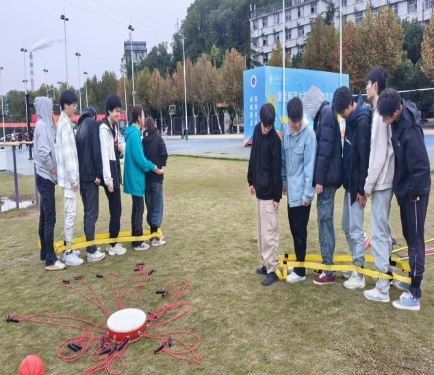 活动进行第二阶段,继续开展其他解压项目,在珠行万里活动中,大家手持道具首尾相接,小心翼翼调整角度,让小球顺利滚向终点,过程中不乏欢声笑语;不倒森林、呼啦圈项目则考验着同学们的反应速度与身体协调性,大家相互配合、彼此鼓励,沉浸在轻松愉悦的氛围中;合力搭建环节,各队伍展开创意构思,在15分钟内完成作品搭建;同心击鼓项目中,队员们均匀分布在鼓周围,协同拉动绳索控制鼓面摆动,让小球在鼓面上持续颠动,现场喝彩声不断。