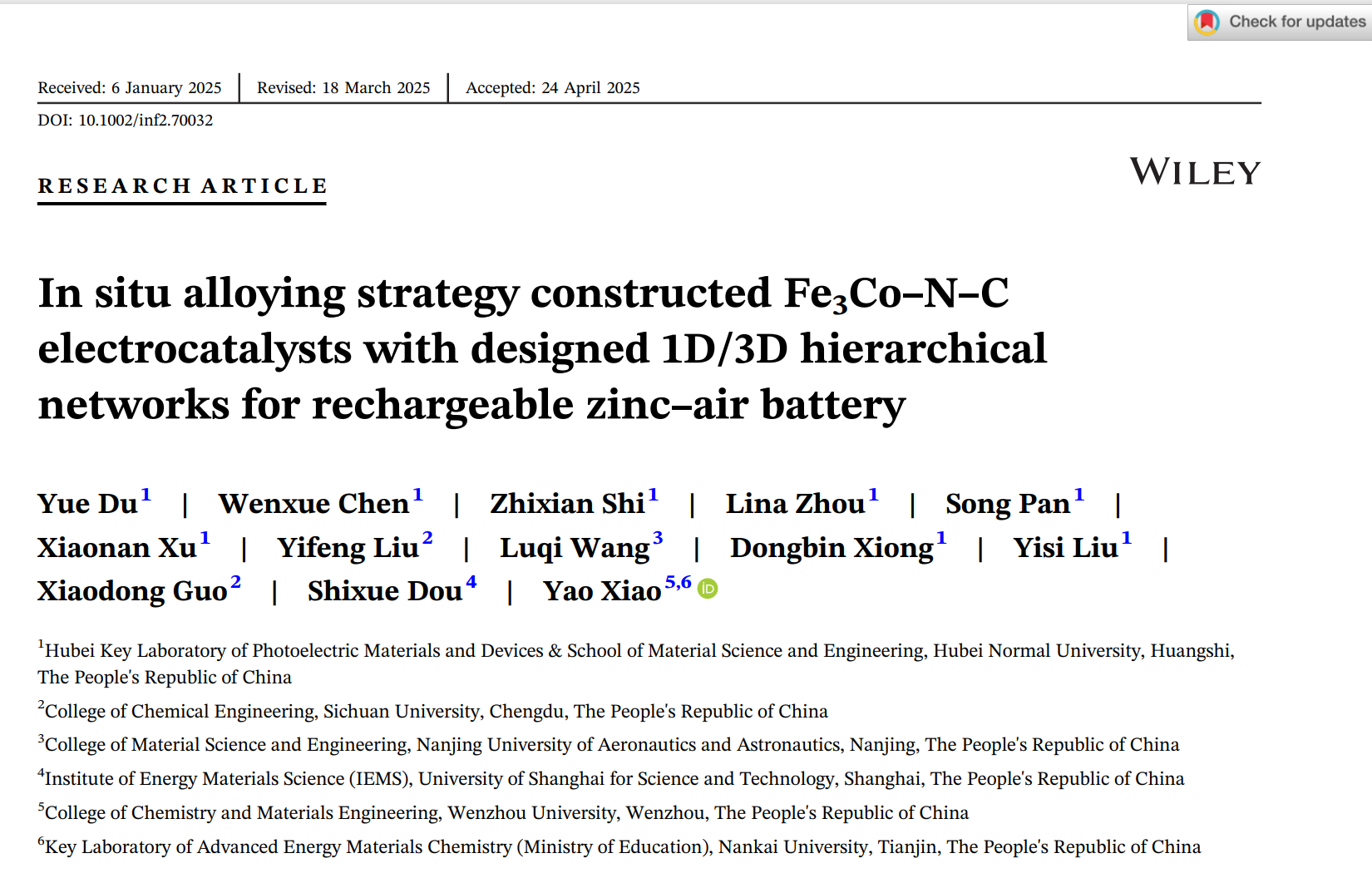 Yue Du, Wenxue Chen, Zhixian Shi, Lina Zhou*, Song Pan, Xiaonan Xu, Yifeng Liu, Luqi Wang, Dongbin Xiong, Yisi Liu*, Xiaodong Guo, Shixue Dou, and Yao Xiao*.In situ alloying strategy constructed Fe3Co-N-C electrocatalysts with designed 1D/3D hierarchical networks for rechargeable zinc-air battery.InfoMat, 2025, e70032. (中科院一区TOP期刊,IF=22.7)