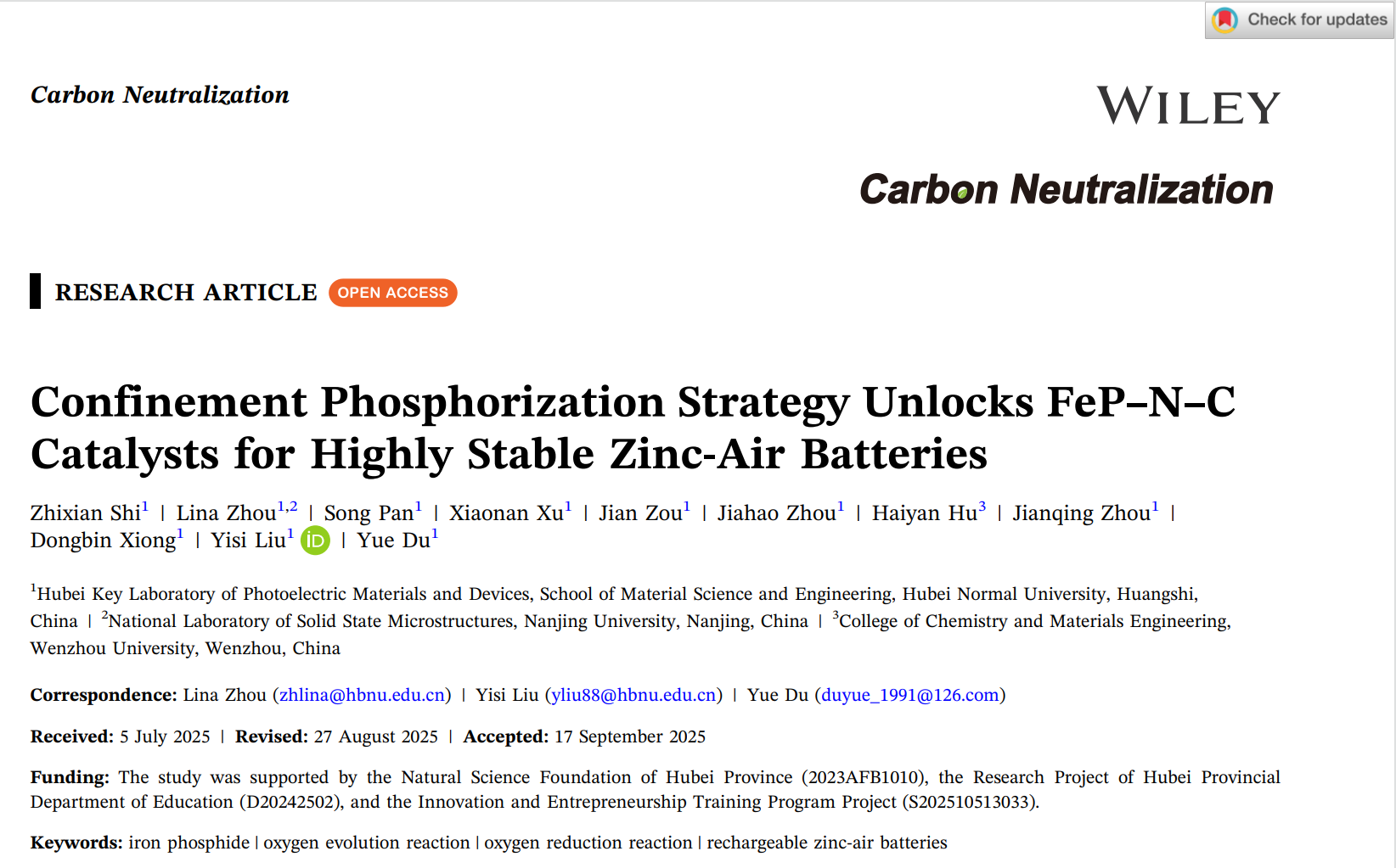 2025年9月,Carbon Neutralization(《碳中和》)在线发表研究成果(封面论文),论文题为“Confinement Phosphorization Strategy Unlocks FeP–N–C Catalysts for Highly Stable Zinc-Air Batteries”(限域磷化策略解锁FeP-N-C催化剂用于高稳定锌空气电池)。湖北师范大学为第一通讯单位,团队材料科学与工程学院23级硕士研究生石志贤为第一作者,杜岳、刘易斯副教授和周丽娜博士为论文通讯作者。Carbon Neutralization为中国科技期刊卓越行动计划高起点新刊,影响因子为12(材料科学领域期刊排名43/461)。该研究围绕锌空气电池阴极在长期循环过程中易发生活性衰减与结构失稳的关键瓶颈问题,提出了一种限域磷化策略,在纳米尺度上精准调控FeP活性相的生成过程与界面结构演化行为。该成果因其在结构设计理念、机理认知深度及器件性能方面的综合创新性,被期刊选为封面论文。