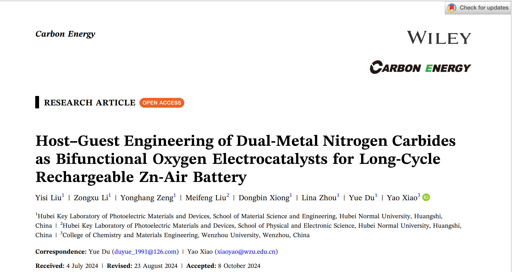 2025年2月,Carbon Energy(《碳能源》)在线发表研究成果,论文题为“Host-guest engineering of dual-metal nitrogen carbides as bifunctional oxygen electrocatalysts for long-cycle rechargeable Zn-air battery”(双金属氮碳化物主客体工程作为长循环可充电锌空气电池双功能氧电催化剂)。湖北师范大学为第一通讯单位,刘易斯副教授为第一作者,杜岳副教授、温州大学肖遥教授为论文通讯作者。Carbon Energy为中科院一区TOP期刊(材料科学领域期刊排名14/461),影响因子为19.5。